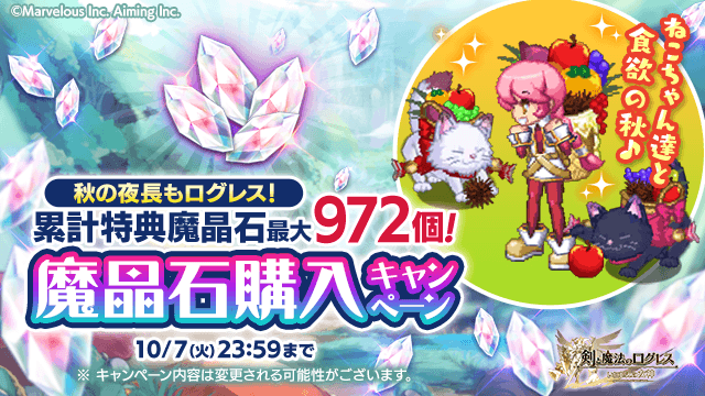 期間中の魔晶石購入金額の合計が60,000円に達すると、限定武器アバター「豊穣の秋」をもれなくプレゼント!
