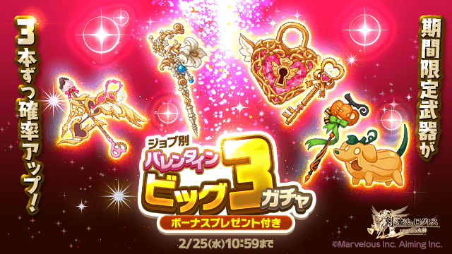 期間中、ガチャの「オススメ」タブにて「ジョブ別 バレンタインビッグ3ガチャ」を販売します。